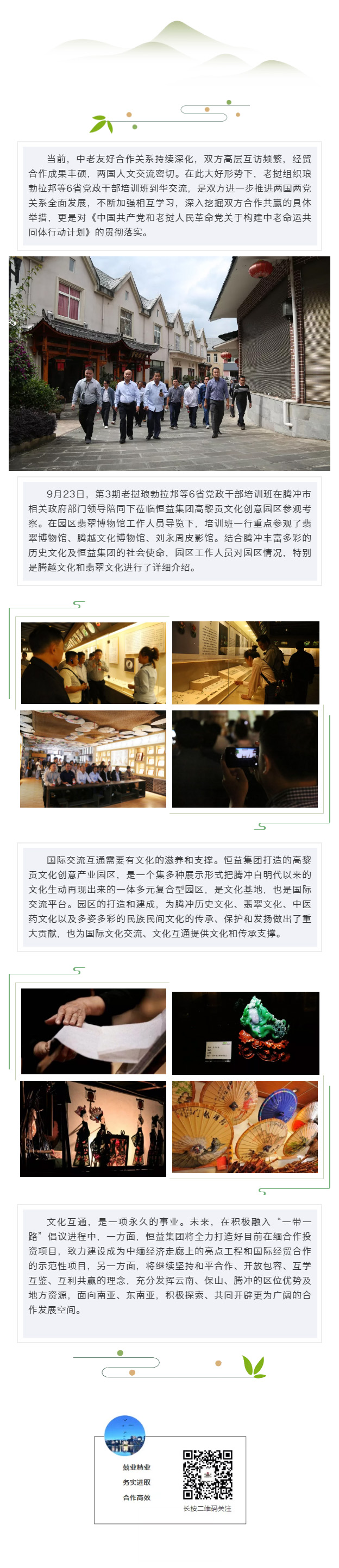 第3期老撾瑯勃拉邦等6省黨政干部培訓(xùn)班蒞臨高黎貢文化創(chuàng)意園區(qū)參觀考察 來源: 瀏覽量:8112 日期:2019-09-24 分享到: 上一篇:騰沖市副市長李屏一行蒞臨恒益健康體檢中心調(diào)研指導(dǎo) 下一篇:商務(wù)部紀檢監(jiān)察穩(wěn)外貿(mào)調(diào)研組蒞臨恒益集團調(diào)研