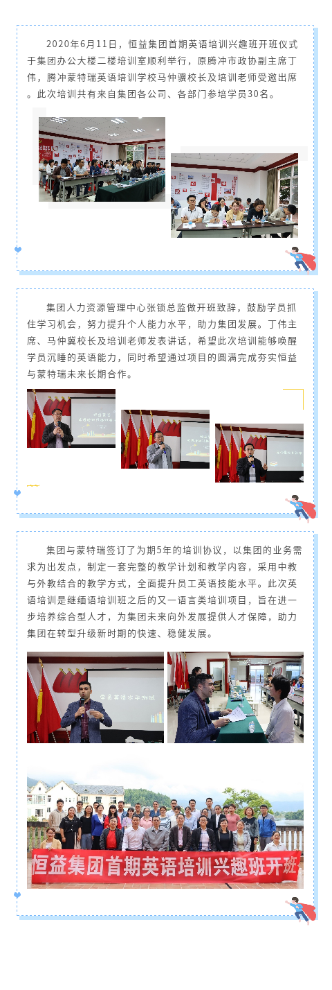 恒益集團首期英語培訓興趣班順利開班 來源: 瀏覽量:7437 日期:2020-06-12 分享到: 上一篇:恒益集團2020年半年度經濟運行分析會隆重召開 下一篇:騰沖市恒益礦產品經貿有限責任公司哨坡選廠脫水干堆、廢水循環利用技術改造項目 環境影響報告書 公眾參與第一次信息公示