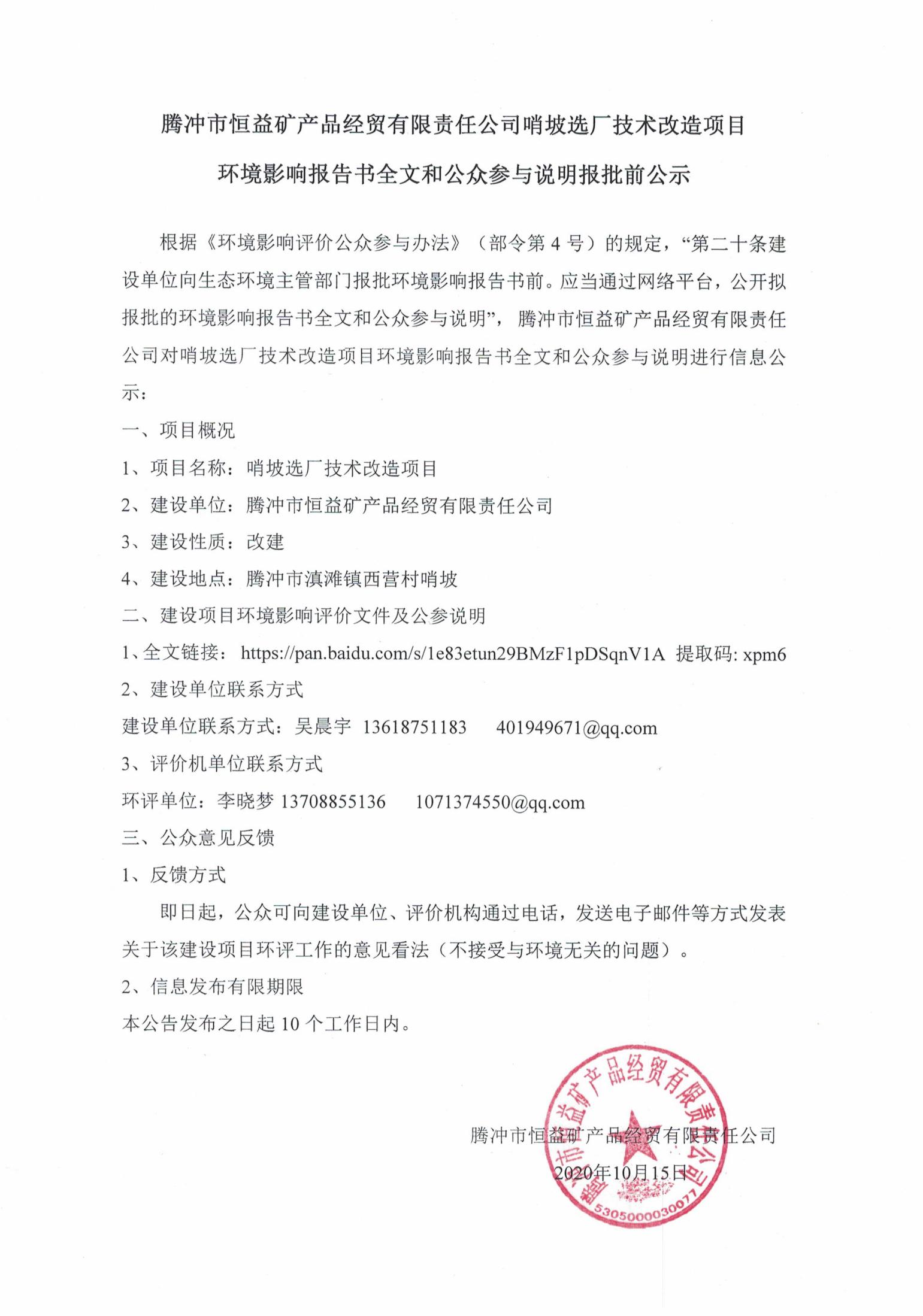 騰沖市恒益礦產品經貿有限責任公司哨坡選廠技術改造項目環境影響報告書全文和公眾參與說明報批前公示 來源: 瀏覽量:7856 日期:2020-10-16 分享到: 上一篇:恒益集團組織召開人才盤點大會 下一篇:恒益集團組織召開2021年全面預算編制工作啟動及培訓會