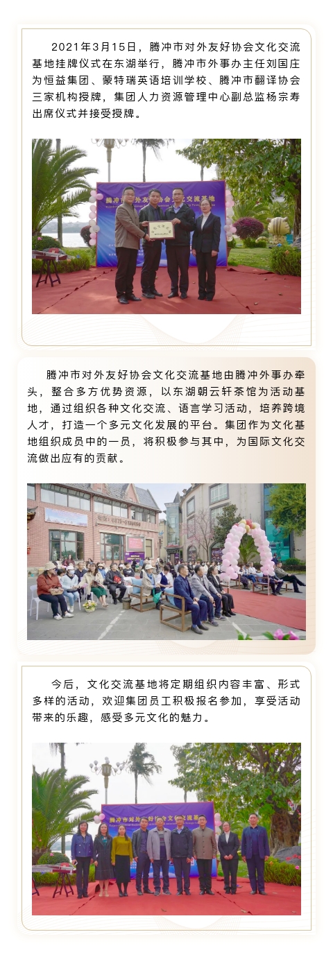 恒益集團掛牌“騰沖市對外友好協會文化交流基地” 來源: 瀏覽量:6805 日期:2021-03-16 分享到: 上一篇:爛刺溝尾礦庫驗收公示內容 下一篇:“東山之下,原創詩歌、散文分享會”在東山書院隆重舉行