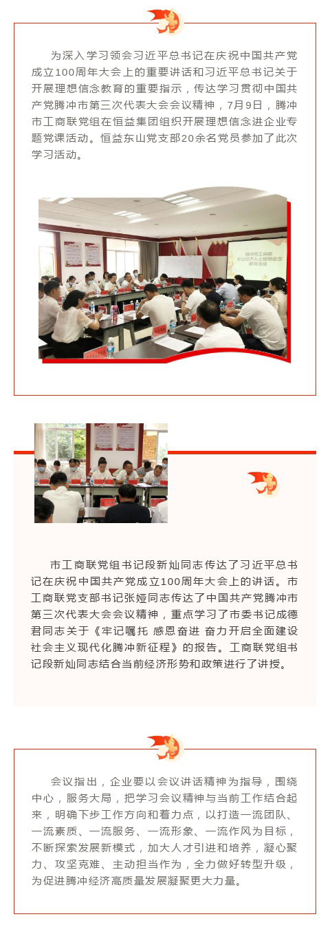 加強理想信念教育 促進恒益更高質量發展 來源: 瀏覽量:6238 日期:2021-07-12 分享到: 上一篇:恒益集團第二屆董事會第三次會議暨2021年半年度經濟運行分析會圓滿舉行 下一篇:“云南省騰沖市中藥材產業科技特派團” 項目啟動會順利召開,助推騰沖中藥材產業發展
