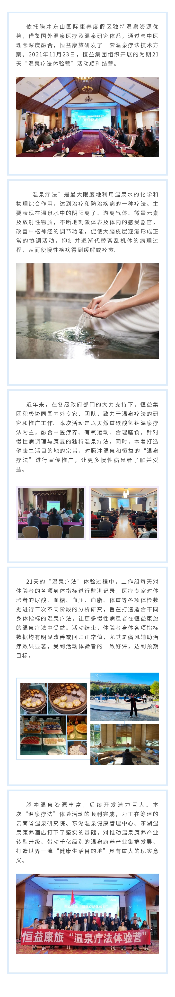 恒益康旅“溫泉療法體驗營”活動順利結營 來源: 瀏覽量:5893 日期:2021-12-01 分享到: 上一篇:政校企共建云南省溫泉研究院簽約儀式成功舉辦 下一篇:“云南省騰沖市中藥材產業科技特派團” 項目第二次會議順利召開,助力騰沖中藥材產業發展
