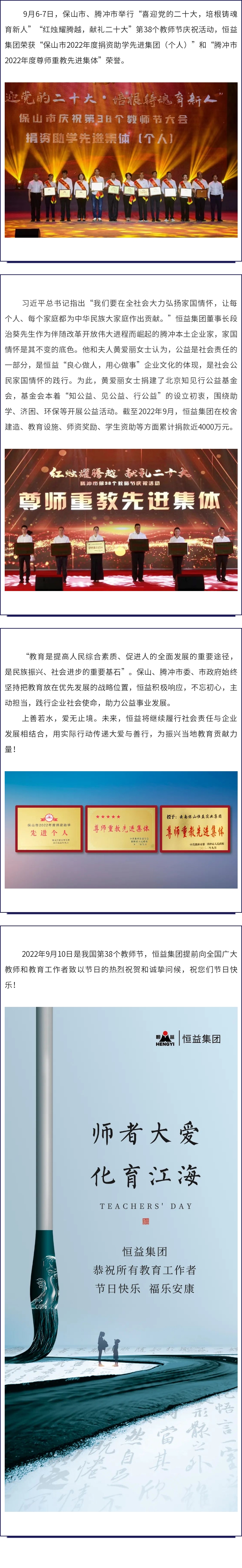 喜訊│恒益集團榮獲捐資助學、尊師重教先進集體(個人) 來源: 瀏覽量:5424 日期:2022-09-09 分享到: 上一篇:恒益集團組織開展新聞寫作專題培訓 下一篇:知見行公益基金會聯(lián)合恒益集團向騰沖市八所學校捐贈230萬元獎教金