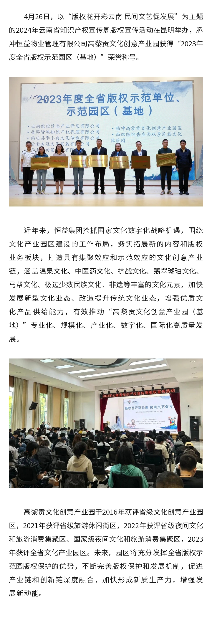 高黎貢文化創意產業園被評為2023年度全省版權示范園區(基地) 來源: 瀏覽量:3883 日期:2024-04-29 分享到: 上一篇:五一假期咋個耍?東山草原活動來襲 下一篇:讓科技創新為騰沖農業發展新質生產力蓄勢賦能